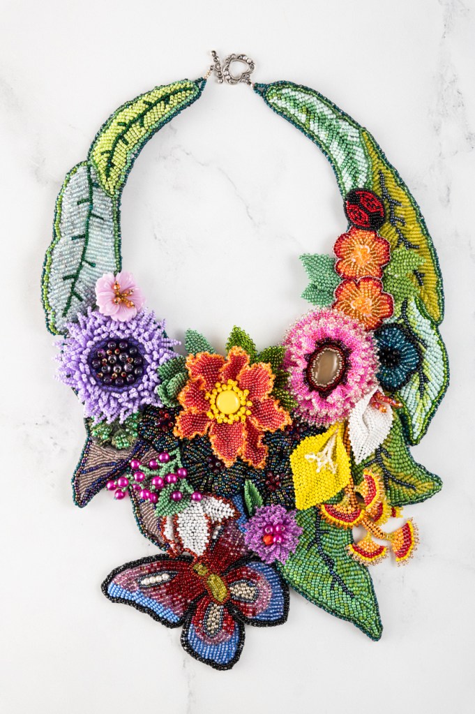 This piece is full of color and life. Each bead, each petal, each butterfly is hand-stitched using a mix of bead weaving and embroidery techniques. I didn’t rush it. I couldn’t. The work asked me to slow down, to be present with every detail. There’s something meditative about building a garden bead by bead—watching it bloom right under your fingers.